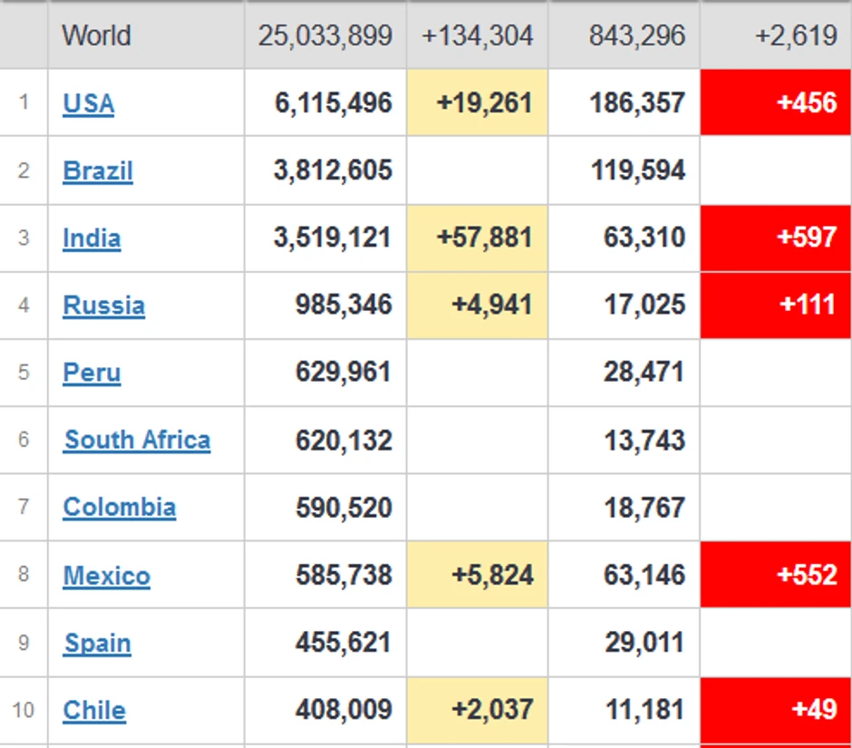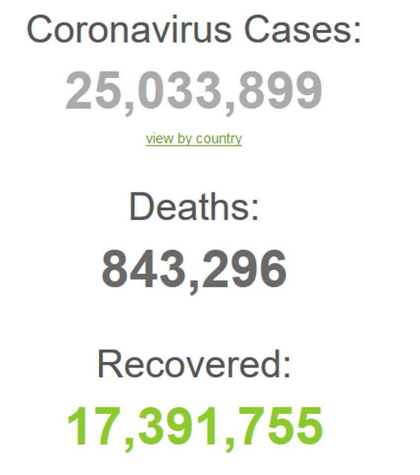 Preciznije, trenutno je u svetu korona virusom zaraženo 25.033.899 osoba, dok je broj umrlih 843.296. Oporavilo se 17.391.755 osoba. Aktivnih slučajeva trenutno je 6,7 miliona.