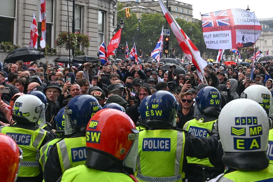 Istovremeno, oko 5.000 demonstranata marša ''Ustanite protiv rasizma'' u Londonu nalazilo se u blizini, a dve grupe je razdvajala policija.