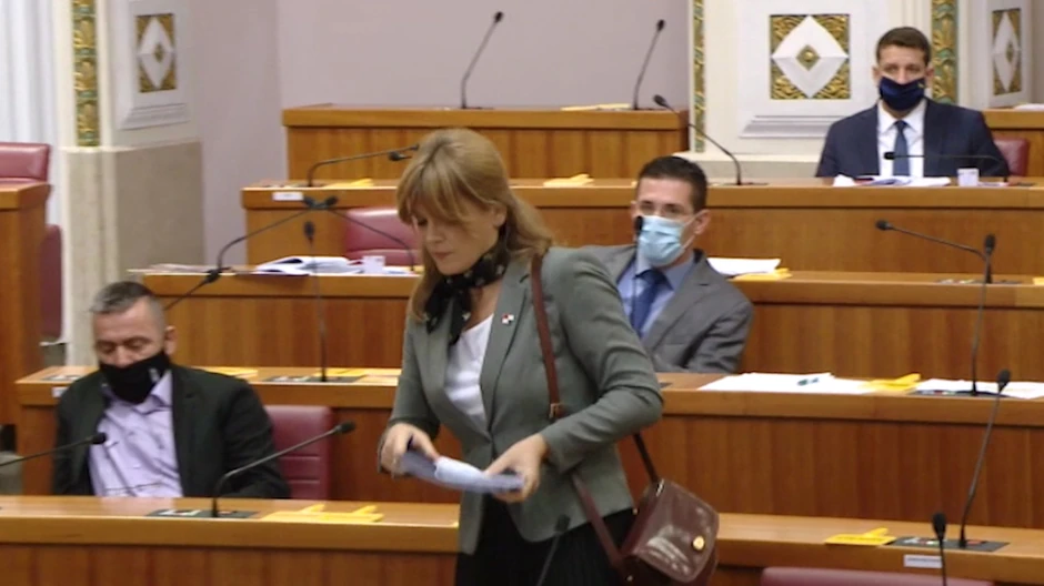 Današnja sednica hrvatskog parlamenta počela je burno, a predsedavajući Gordan Jandroković udaljio je poslanicu Karolinu Vidović Krišto, zbog toga što je uprkos njegovom upozorenju odbila da stavi masku.