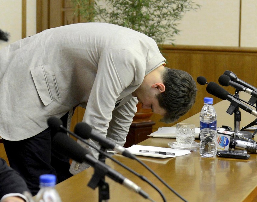Njegov zločin bio je to što je navodno pokušao da ukrade propagandni materijal. Severna Koreja optužila ga je da je u drugoj noći spavanja u hotelu ušao u prostor u koji gosti ne smeju da uđu i skinuo plakat sa zida, a tvrde i da imaju video dokaz o tome. Oto je to kasnije priznao, dok je pred sudom u prostoriji punoj novinara u suzama molio da mu oproste.