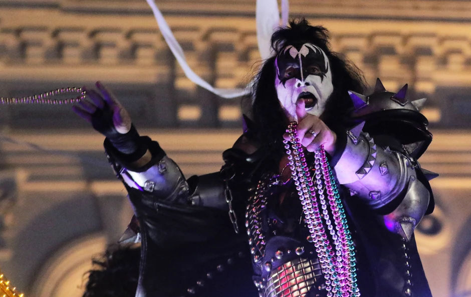 Simonsov scenski nastup uključuje farbu na licu, crnu kožnu odeću i raščupanu kosu.