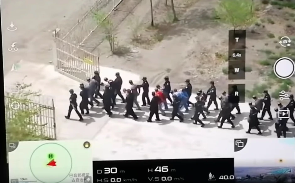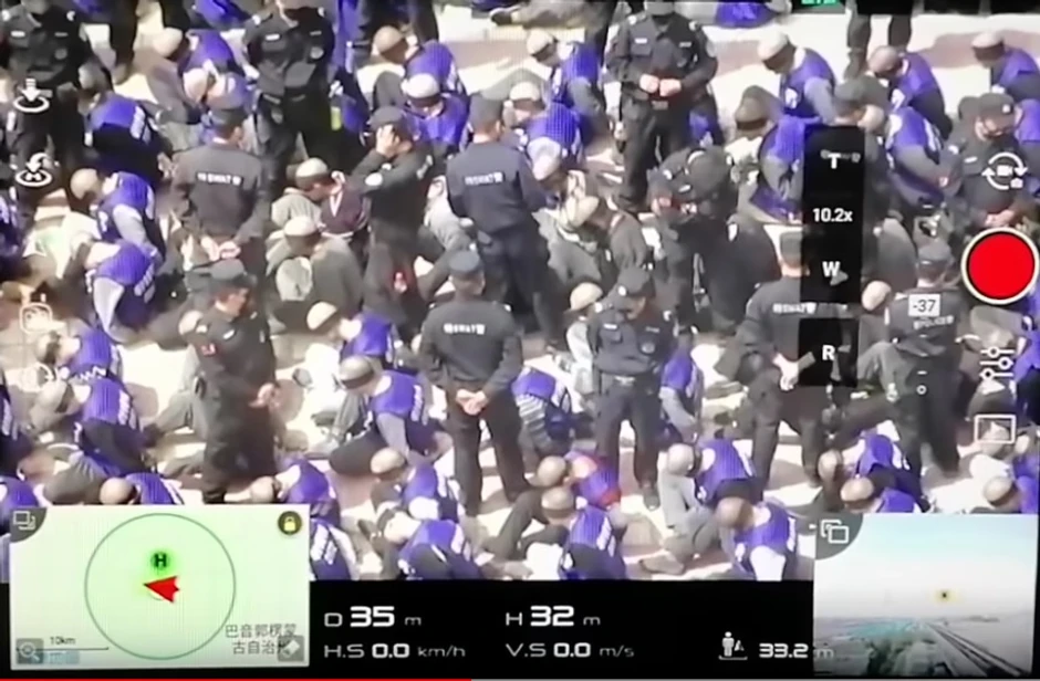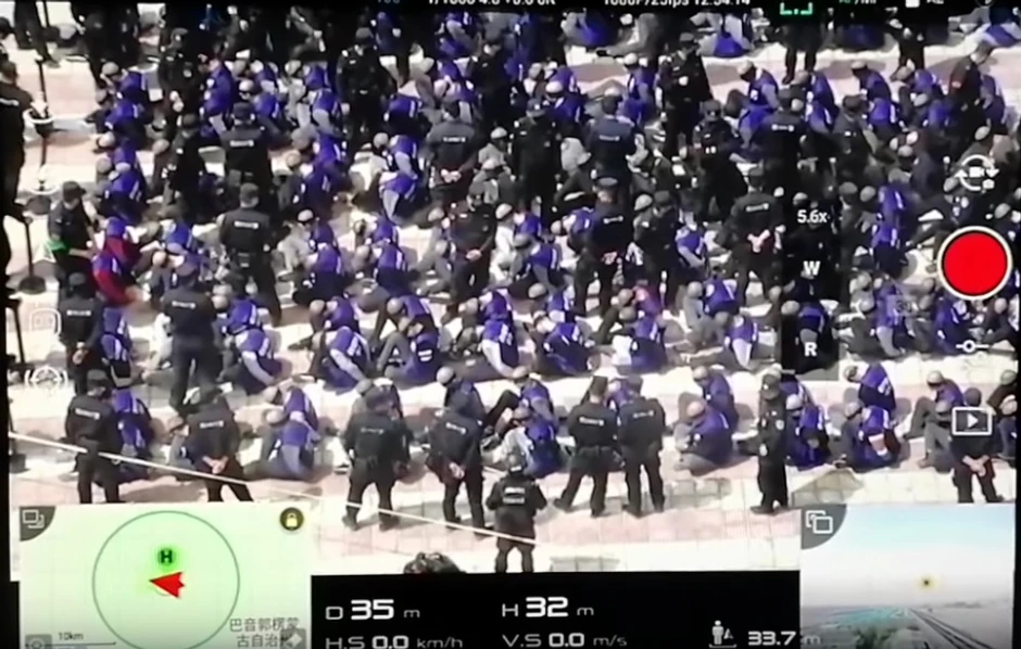 Na snimku načinjenom dronom vidi se kako kineska policija izvodi na stotine zatvorenika, okovanih i sa povezima na očima iz voza, a veruje se da je u pitanju transfer u Sinkjangu.