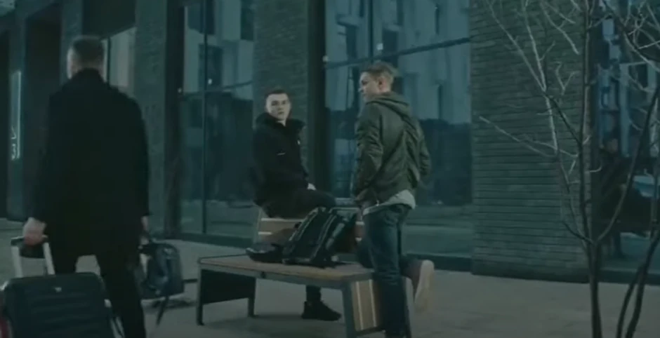 Čovek je prikazan kako nosi svoj prtljag na ulici u Rusiji, dok ga dvojica mlađih muškaraca gledaju.
