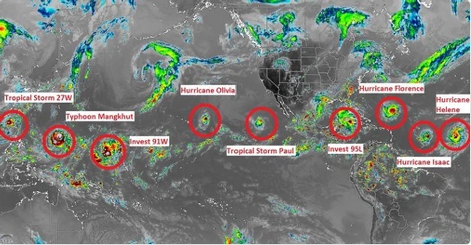 Neverovatni satelitski snimci pokazuju da je uragan "Florens", koji je srećom oslabio, ali i dalje predstavlja pretnju, samo jedna od devet potencijalno smrtonosnih oluja koje trenutno kruže iznad Zemlje. Na slikama su istaknute lokacije koje će tokom ove nedelje pogoditi ekstremne oluje.