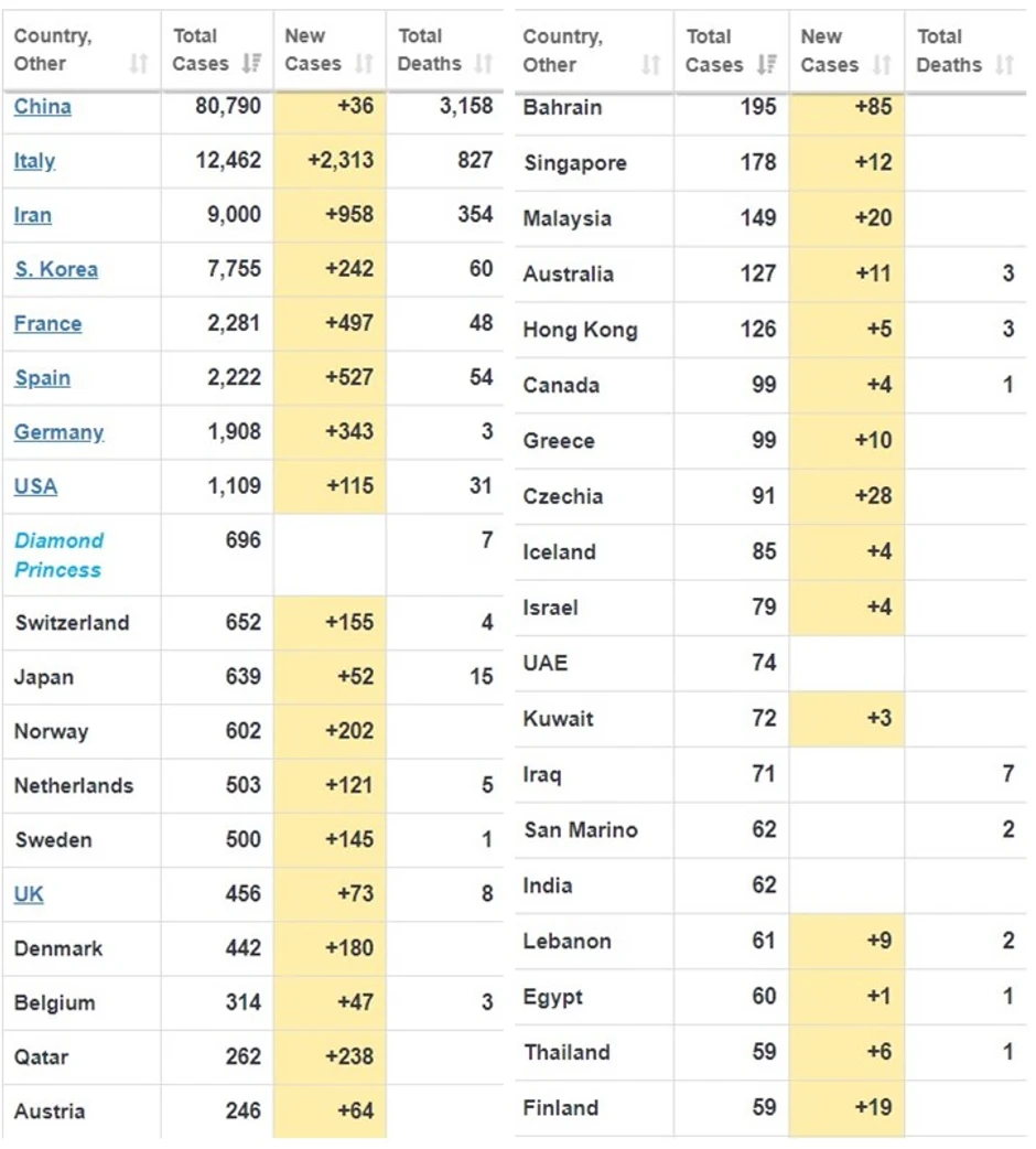 Zemlja u kojoj je najveći broj zaraženih je Kina u kojoj danas ima 16.021 bolesnih, a do sada oporavilo 61.611 ljudi. U Kini je od posledica korona virusa umrlo 3.158 ljudi, a ukupan broj zaraženih od početka epidemije veći je od 80.790.