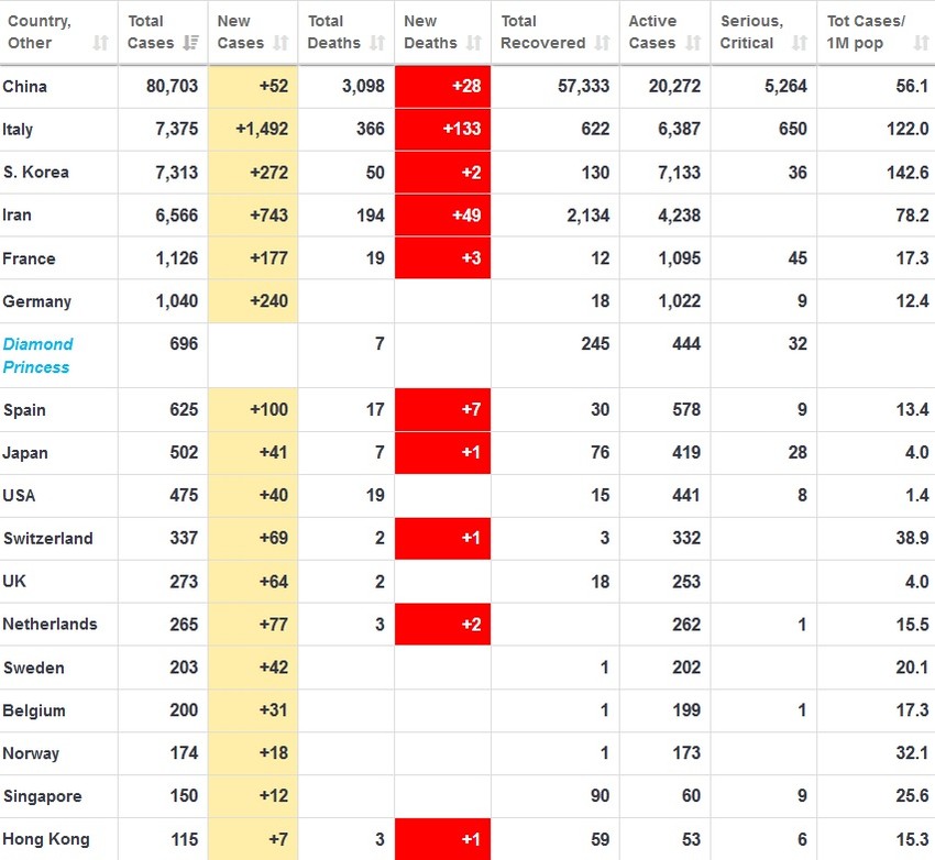 U međuvremenu dramatično raste i broj zaraženih u drugim državama Evrope. Francuska i Nemačka imaju više od 1.000 zaraženih, s tim što je Francuska zabeležila i 16 preminulih od bolesti, dok u Nemačkoj za sada nema žrtava. U Španiji je u jednom danu broj zaraženih porastao za 100, a umrlih za sedam.