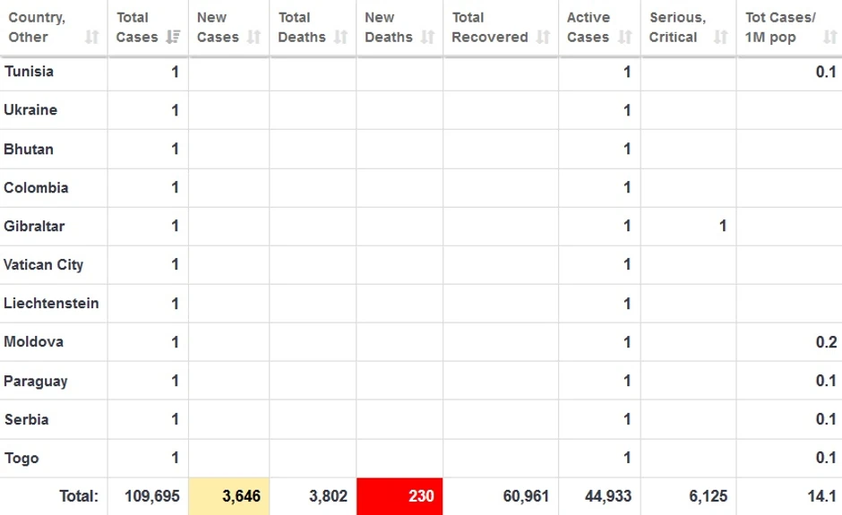 Prema poslednjim podacima, broj zaraženih korona virusom u svetu je porastao na gotovo 110.000, dok je preminulo više od 3.800 ljudi. Dobra vest je da se skoro 61.000 pacijenata oporavila od zaraze.