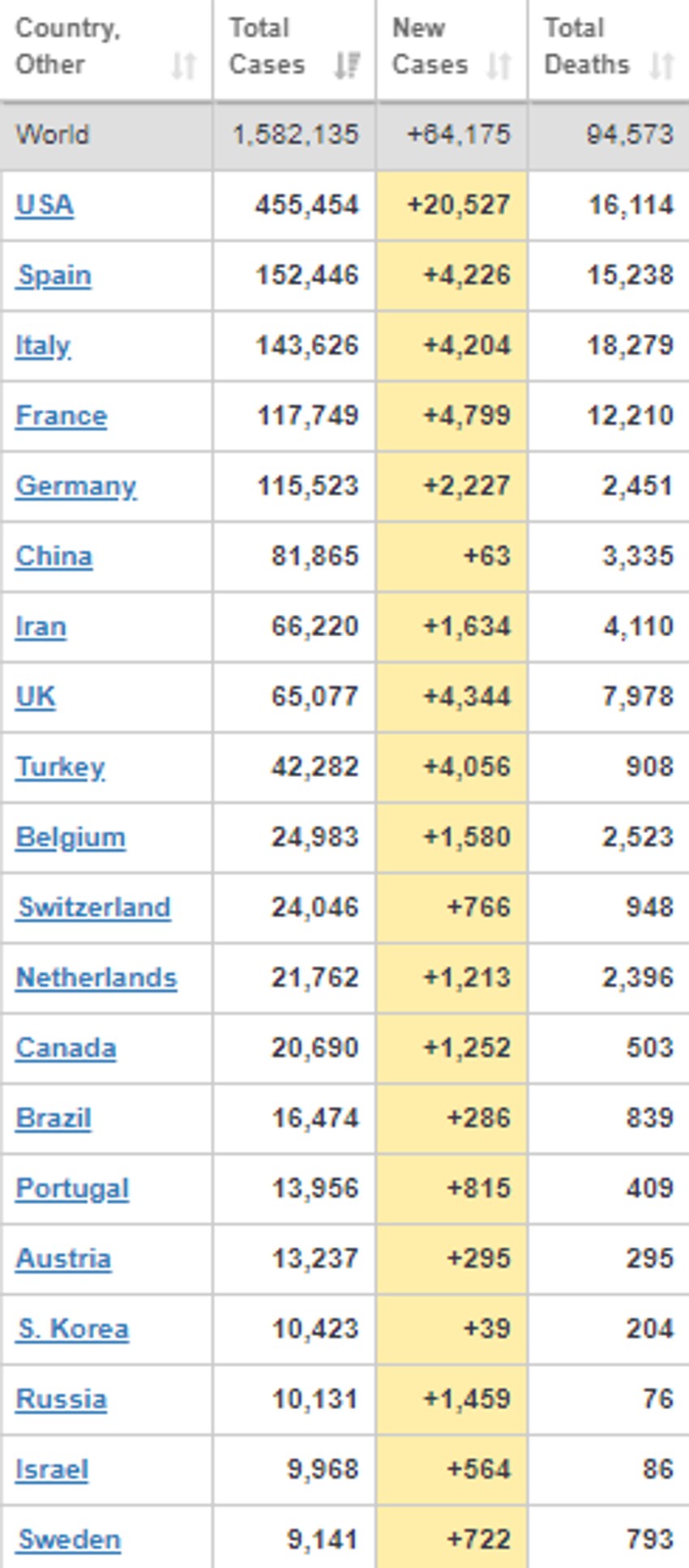 Najveći broj zaraženih i danas je u SAD, ukupno 455.454, slede Španija sa 152.446, Italija sa 143.626, Francuska sa 117.749, Nemačka sa 115.523, Kina sa 81.865 i Iran sa 66.220 obolelih.
