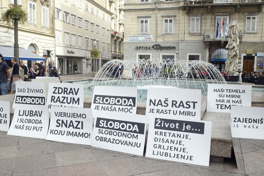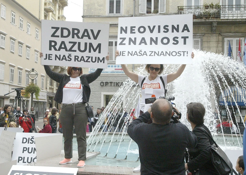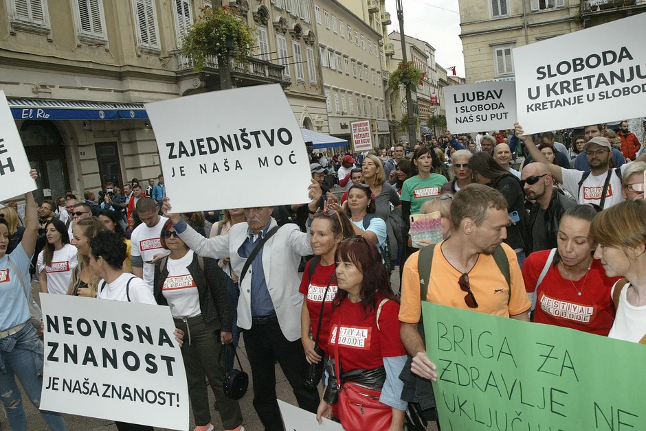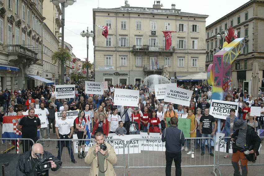 Nekoliko stotina ljudi okupilo se danas na protestu protiv mera za suzbijanje korona virusa u Rijeci, koji kao i nedavni protest u Zagrebu, nosi ime Festival slobode.