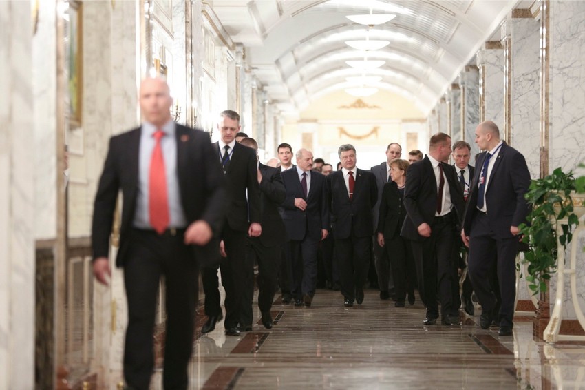 Francuski predsednik Fransoa Oland i nemačka kancelarka Angela Merkel i predsednici Rusije i Ukrajine, Vladimir Putin i Petro Porošenko imali su nekoliko rundi razgovora iza zatvorenih vrata, prvo sami, zatim sa saradnicima i na kraju ponovno u četiri oka.