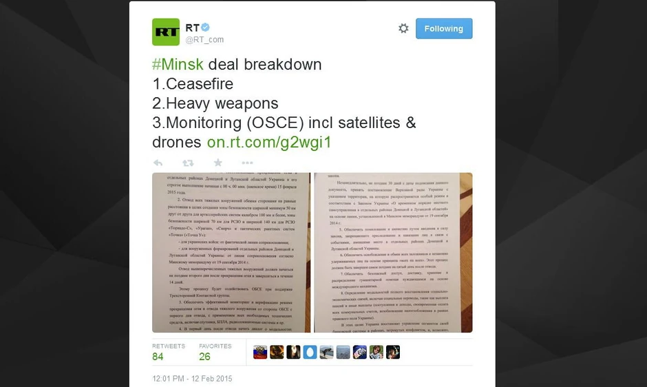 "Raša tudej" je pre toga prenela da su predstavnici samoproglašene Donjecke republike odbili da potpišu nacrt sporazuma o prekidu vatre. Oni su od Kijeva tražili da se ukrajinska vojska povuče iz mesta Debeljcevo, koje je ukrajinsko uporište duboko u teritoriji pobunjenika. Ukrajinska vojska tamo je opkoljena, a žestoke borbe se vode paralelno s pregovorima u Minsku.
