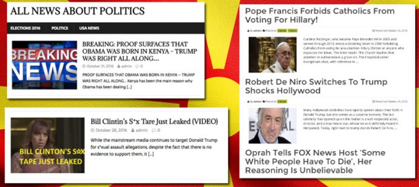 Priča o Hilarinoj lažnoj izjavi potekla je sa portala "TheRightists.com", koji je priznao da je čitav tekst izmišljen. Klintonova je 2013. rekla da bi "volela da u politici vidi više poslovnih ljudi", ali ni u jednom momentu nije spomenula Trampa. Četiri od pet najčitanijih tekstova za makedonskih sajtova pokazalo se kao netačno, od onog da je "papa podržao Trampa", do onog da je Majk Pens rekao da je "Mišel Obama najvulgarnija osoba na svetu". Ta četiri lažna teksta na Fejsbuku imala više od milion deljenja, reakcija i komentara, generišući ogroman protok korisnika, i ujedno doneli veliki novčani prihod vlasnicima sajtova koji su ih objavili.