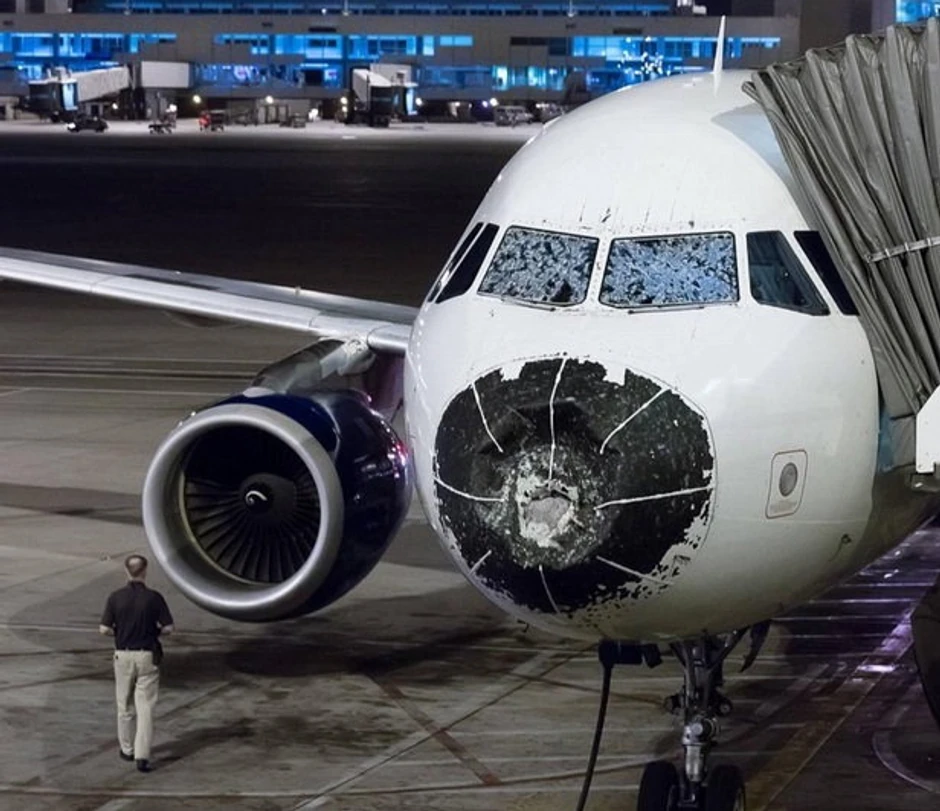 Prema pisanjima tamošnjih medija, “erbasovom” avionu A320 je nevreme izrešetalo vetrobransko staklo, a otpao mu je i deo nosa.