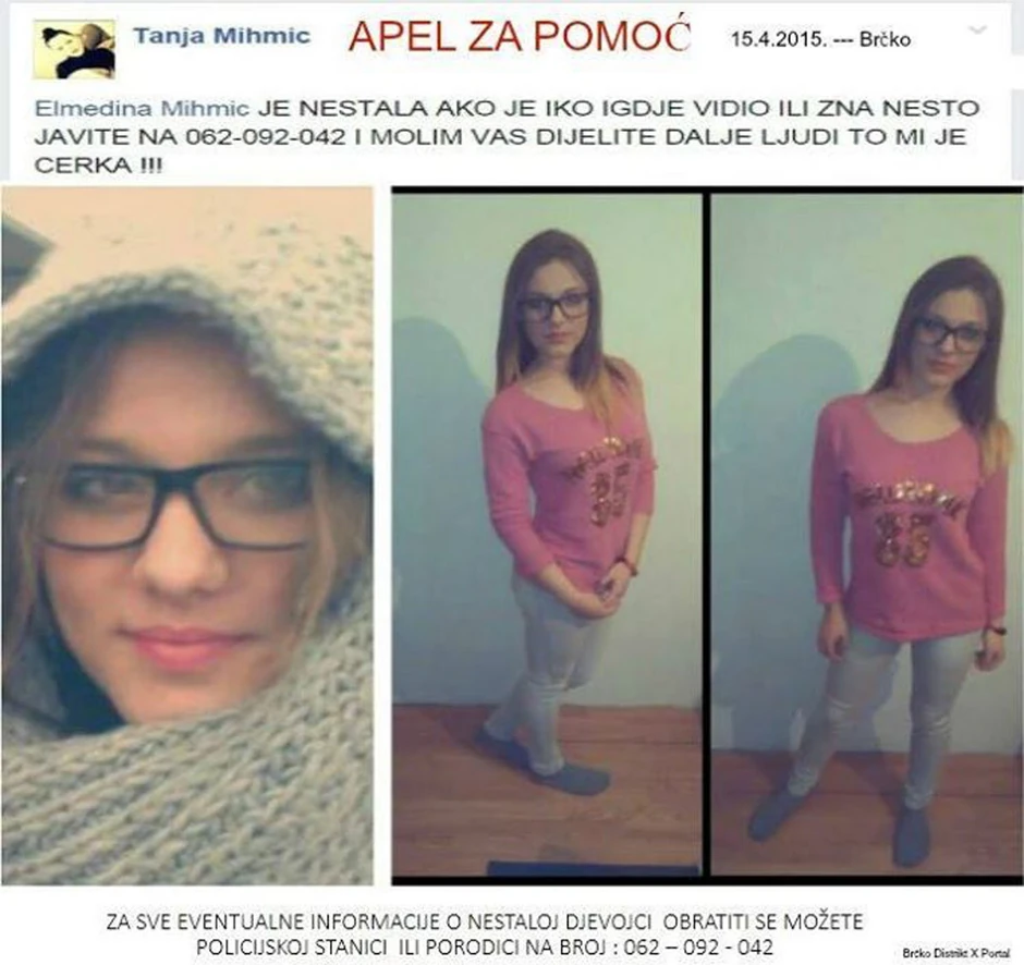 U toku jučerašnjeg dana nestala je mlada Brčanka, učenica Srednje poljoprivredne škole, Elmedina Mihmić (16). Njena majka apeluje na sve građane da jave ako bilo šta znaju o njoj.