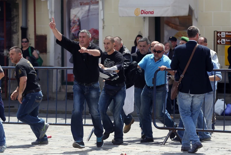 Do Markovog je trga sinoć je stigla i grupa mlađih muškaraca, koji su vređali policiju i uzvikivali "Za dom spremni". Policajci su pokušali da i smire ali huligani su počeli da trče nateravši interventne brigade da stave šlemove na glave, javlja Jutarnji list.