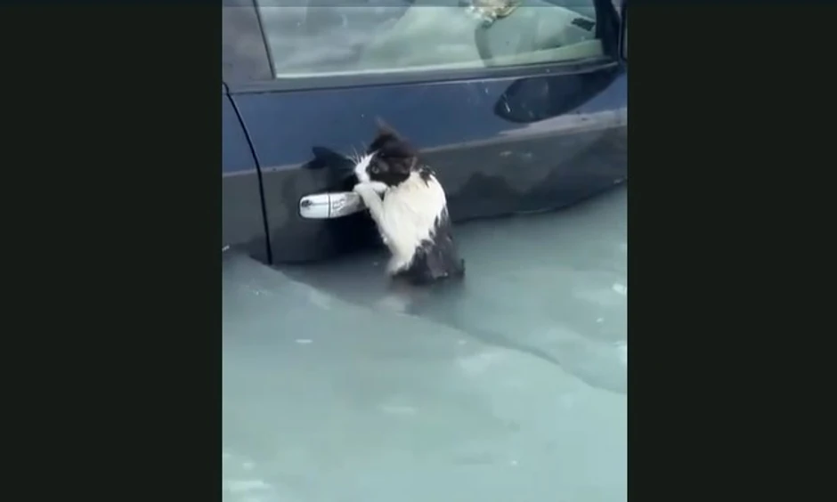 Policija u Dubaiju spasila je mačku koja se poslednjim atomima snage držala o kvaku automobila usred poplave u gradu, koja je nastala posle rekordne kiše.
