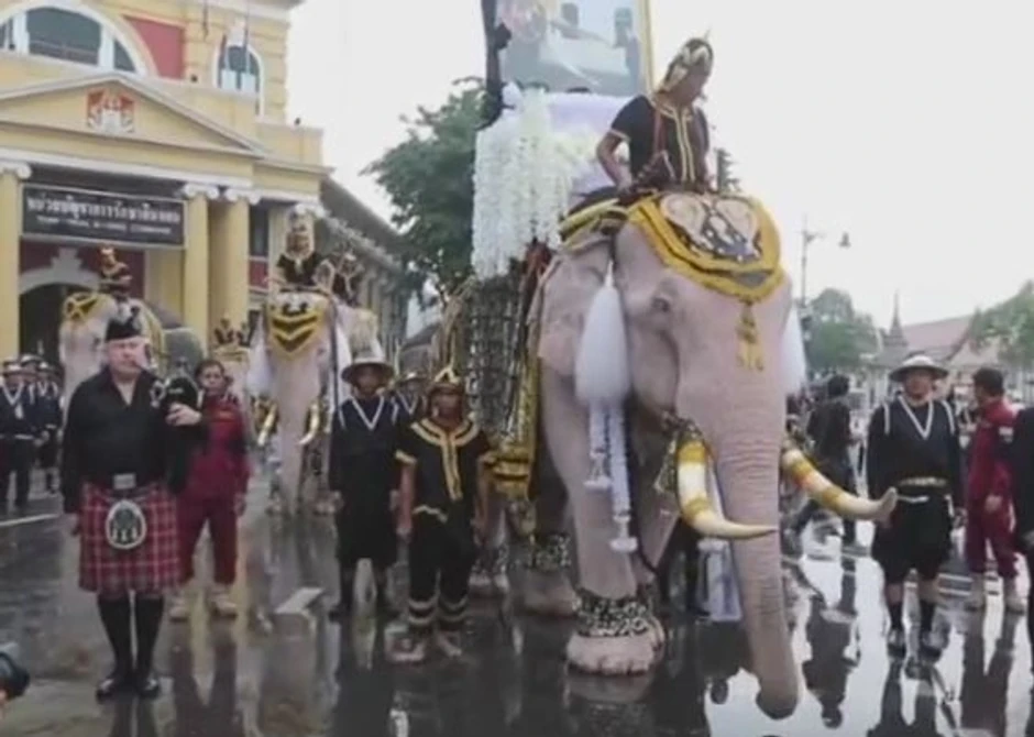 Slonovi i njihovi vodiči kleknuli su ispred kapija palate, dok je na jednoj trubi svirana kraljevska himna, prizor zbog kojeg su zaplakali mnogi Tajlanđani koji su čekali da uđu u palatu i odaju počast kralju.