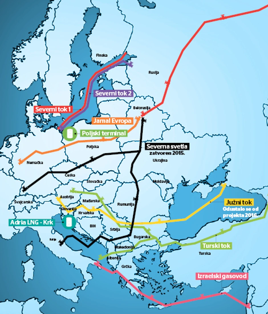Plutajući terminal za tečni prirodni gas na ostrvu Krk u Hrvatskoj očekuje se da bude završen do 2019. godine, a prema procenama, imaće kapacitete od oko dve milijarde kubnih metara godišnje i biće namenjen hrvatskom, ali i evropskom tržištu. Kako je planirano, kada bude izgrađen, do njega će se brodovima isporučivati gas iz Amerike i Australije. Ovo je jedna od ključnih tačaka američkog suprotstavljanja ruskom izvozu gasa u Evropi i nalazi se na granici sukoba interesa dve sile.