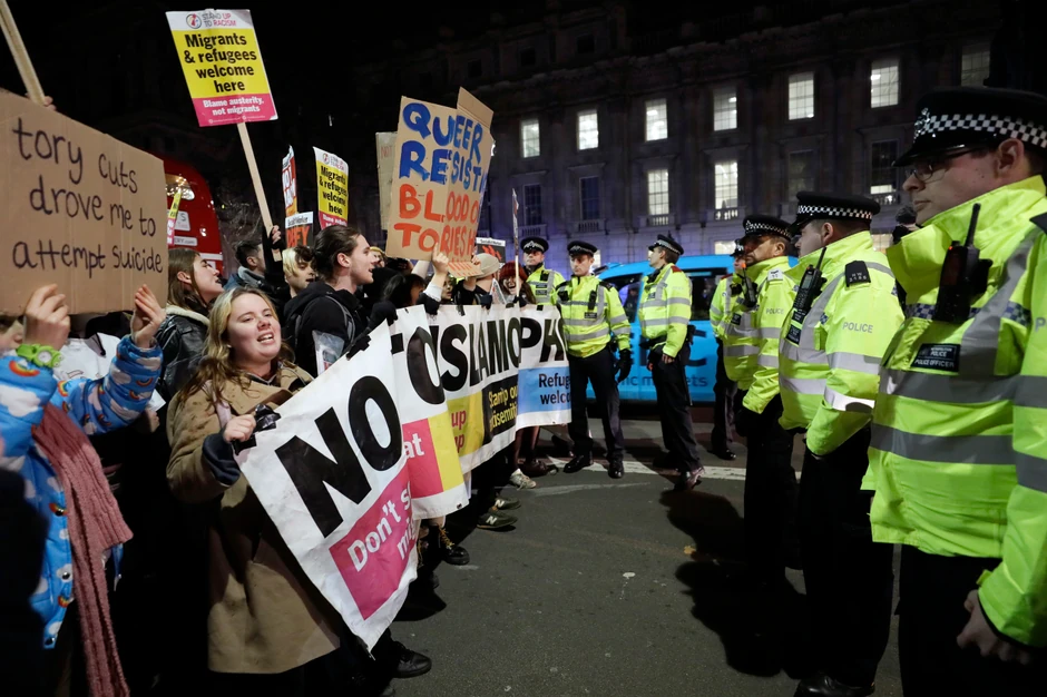 Demonstranti su nosili transparente na kojima je pisalo "Prkosimo torijevskoj vladavini" i "Izbeglice, dobro došli", hodali su od kabineta premijera u ulici Dauning do Trafalgar skvera i teatarskog dela grada, blokirali saobraćaj i izazvali dolazak velikog broja policajaca.