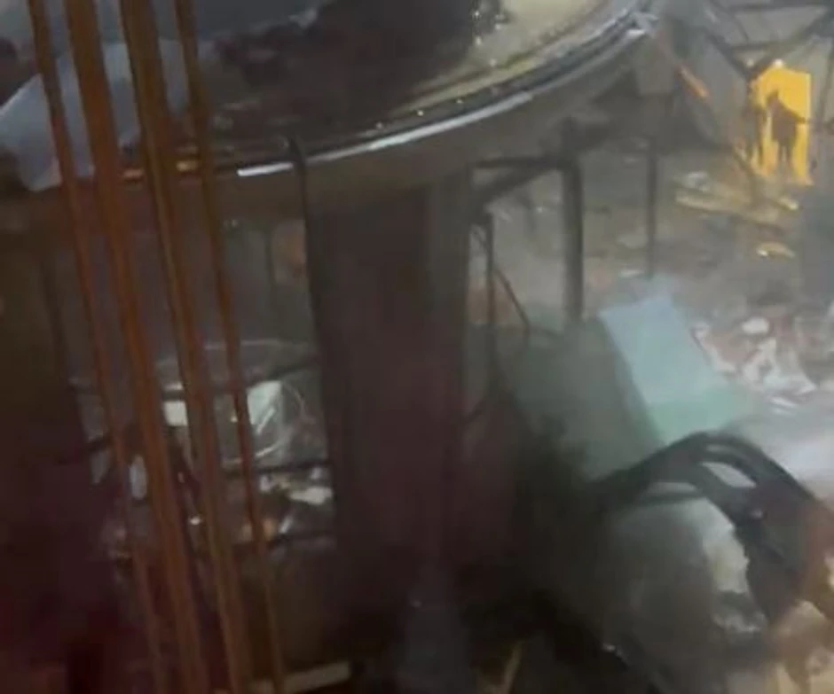 Na snimku se vidi haos koji je nastao nakon pucanja akvarijuma - lobi hotela je u ruševinama, a voda curi na pod.