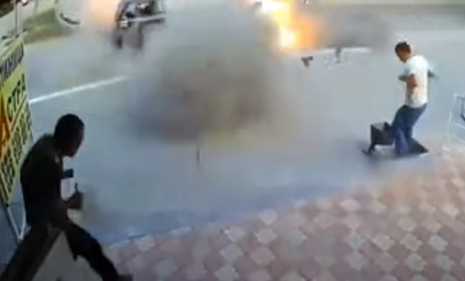 Ogromnu eksploziju pratila je zapaljena olupina koja je nastavila da se kreće niz ulicu.