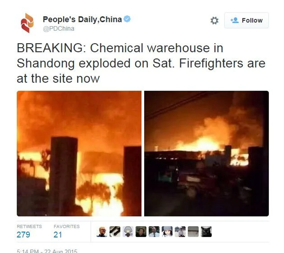 Desila se velika eksplozija u hemijskom skladištu u provinciji Šangdong u istočnoj Kini, javio je list "Dejli Čajna", a prenosi "Raša tudej". Skladište je udaljeno samo 1 kilometar od prvih naselja.