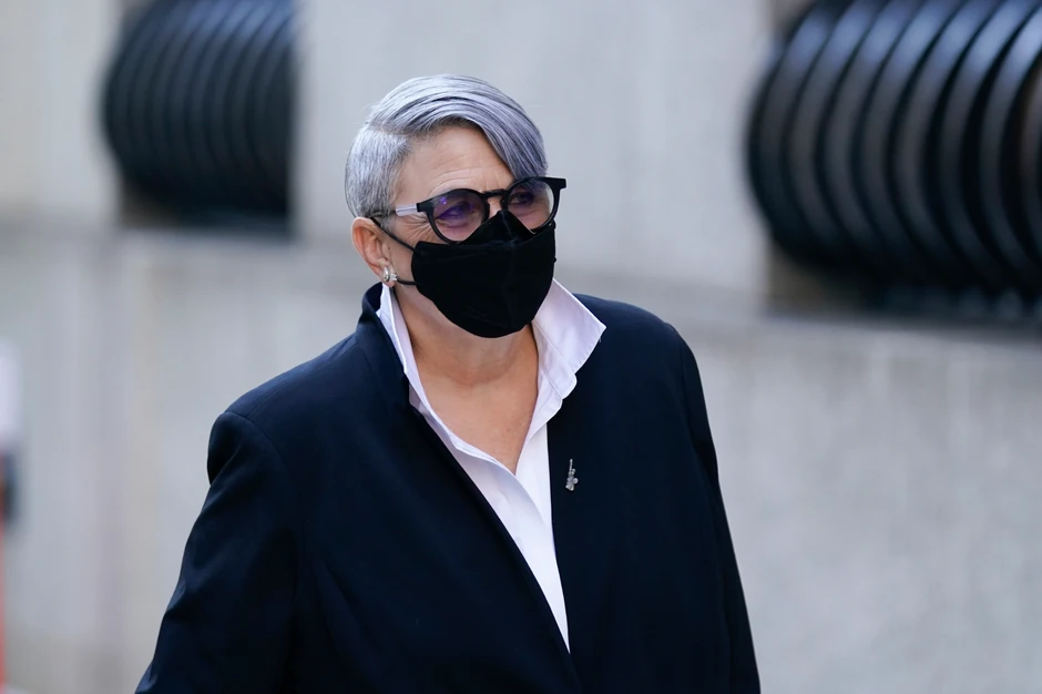 Ona se na suđenju pojavila u plavom sakou i beloj košulji, a na očima je nosila naočare i sve vreme se krila iza zaštitne maske. Sve vreme je sedela između svojih advokata.