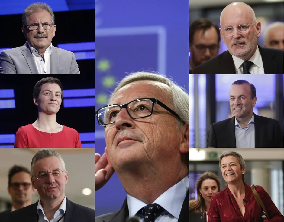 Kandidati su Manfred Veber, Nemac iz Evropske narodne partije (EPP) desnog centra, Frans Timermans, Holanđanin iz partije levog centra Evropskih socijalista (PES), Niko Kue, Španac iz Evropske levice, Ska Keler, Nemica iz Evropske partije zelenih, Jan Zahradil, Čeh iz evroskeptične Alijanse konzervativaca i reformista Evrope (ACRE) i Margret Vestager, Dankinja iz Alijanse Liberala i demokrata za Evropu (ALDE).