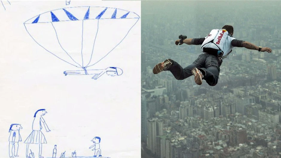 Austrijanac Feliks Baumgartner (43), prvi čovek koji je probio zvučnu barijeru skočivši s visine od 39 kilometara iznad Zemlje, kao petogodišnjak je nacrtao crtež koji je nagovestio čime će se baviti u budućnosti.