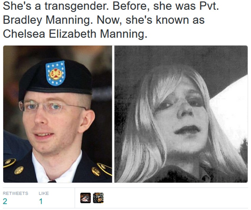 Čelsi Mening je rođena kao Bredli Mening, ali je 2013. godine nakon izricanja presude, rekla da se oseća kao žena, promenila ime i počela s hormonskom terapijom. Do danas u javnosti je procurila samo jedna slika Mening i to ona crno-bela koju je vojska objavila 2013. godine.