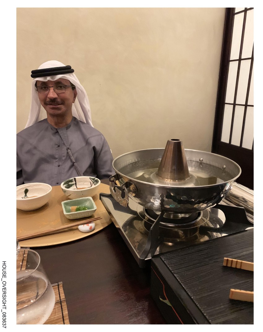 Treća fotografija je na tanjiru blizu Epstajnove leve ruke. Nemoguće je videti šta prikazuje, ali crni okvir oko njega sugeriše da sadrži barem jednu osobu čiji se identitet štiti.