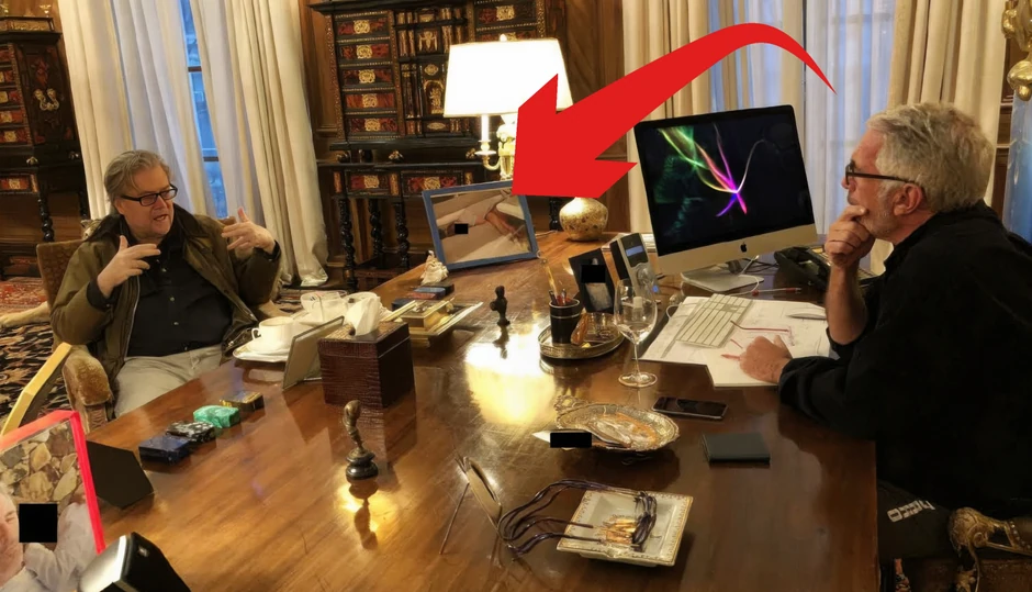 Na jednoj od nedatiranih fotografija, Epstajn sedi za svojim stolom nasuprot desničarskog političkog stratega Stiva Benona u Epstajnovoj kući na Menhetnu. Njih dvoje su imali profesionalni odnos 2018. i 2019. godine, kada je Benon pružao Epstajnu medijske konsultacije i savete o rehabilitaciji njegovog javnog imidža.