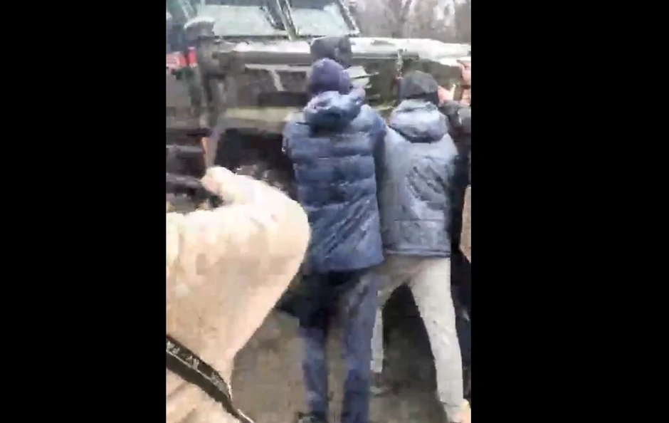 Na snimku se vide Ukrajinci koji zaustavljaju ruski vojni konvoj i viču im "idite kući".