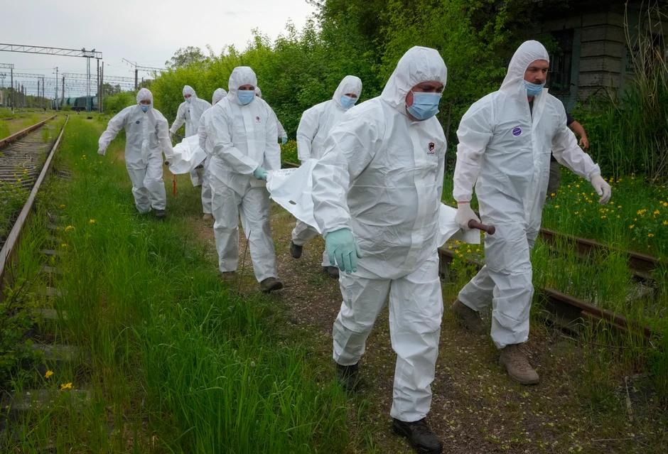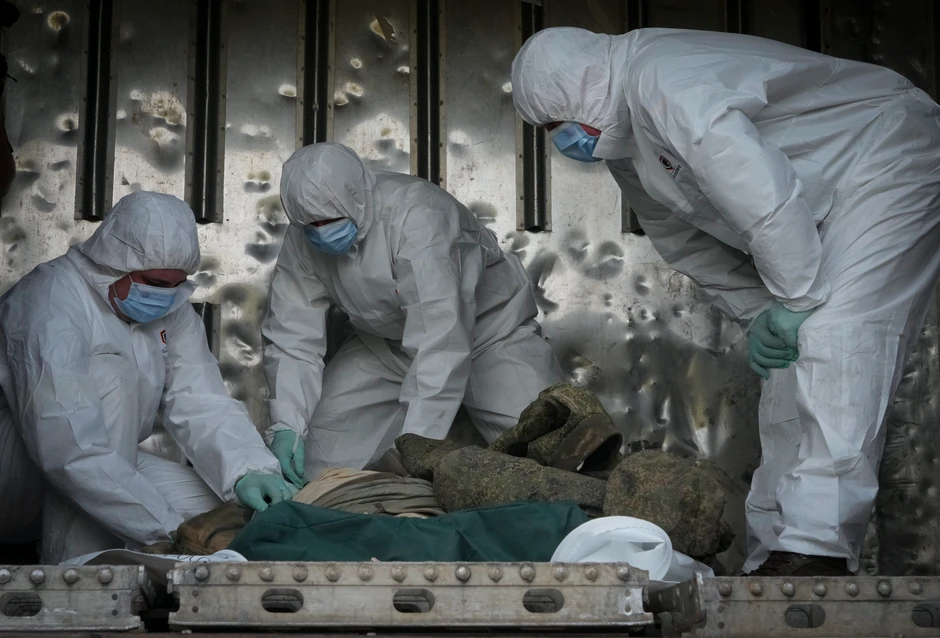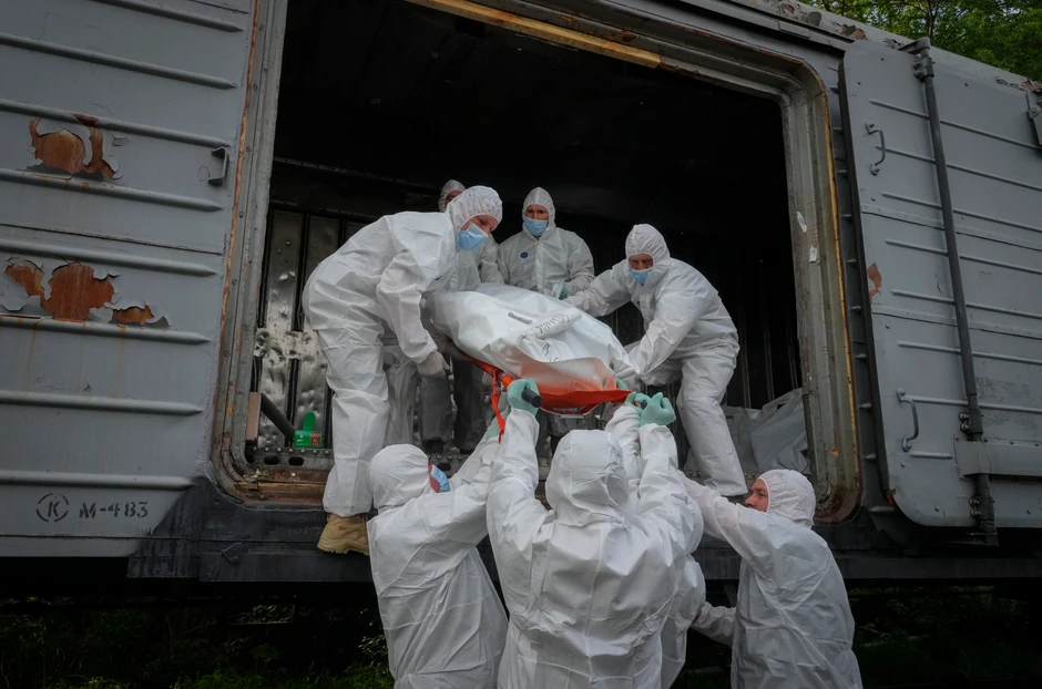 Tela ruskih vojnika ubijenih u Ukrajini doneta su ispred železničkog čvorišta kod Kijeva i stavljena sa stotinama ostalih u voz sa hladnjačama, gde će ostati do trenutka kada će biti vraćeni svojim porodicama.