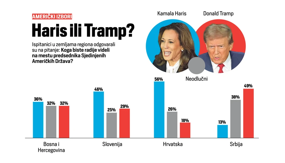 Bosna i Hercegovina pokazuje izjednačene stavove, dok u Srbiji Tramp ima značajnu podršku, sa gotovo polovinom građana koji bi ga radije videli na čelu Amerike. Haris pak uživa najmanje poverenje u ovoj zemlji, sa samo 13 posto podrške.