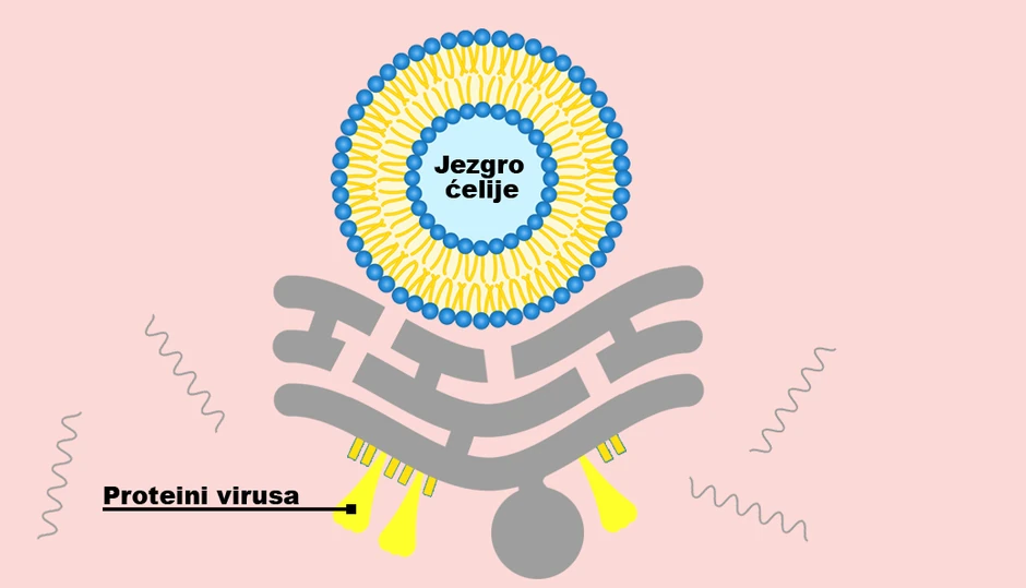 Virus inficira ćeliju spajajući svoju masnu membranu sa membranom ćelije. Jednom kad se nađe unutra, korona virus oslobađa isečak genetskog materijala koji se zove RNK (ribonukleinska kiselina).