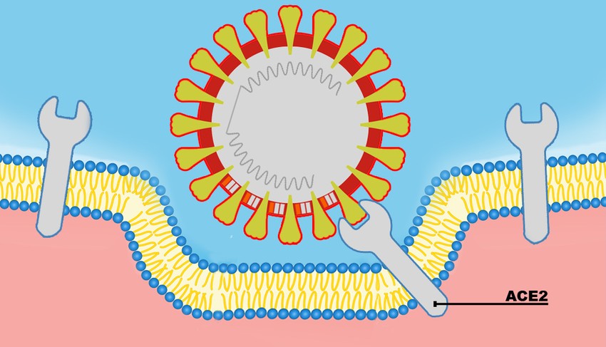 Virus ulazi u telo preko nosa, usta ili očiju, zatim se kači za ćelije u disajnom putu koje proizvode protein ACE2. Veruje se da je virus originalno nastao u slepim miševima, gde se kačio za slične proteine.