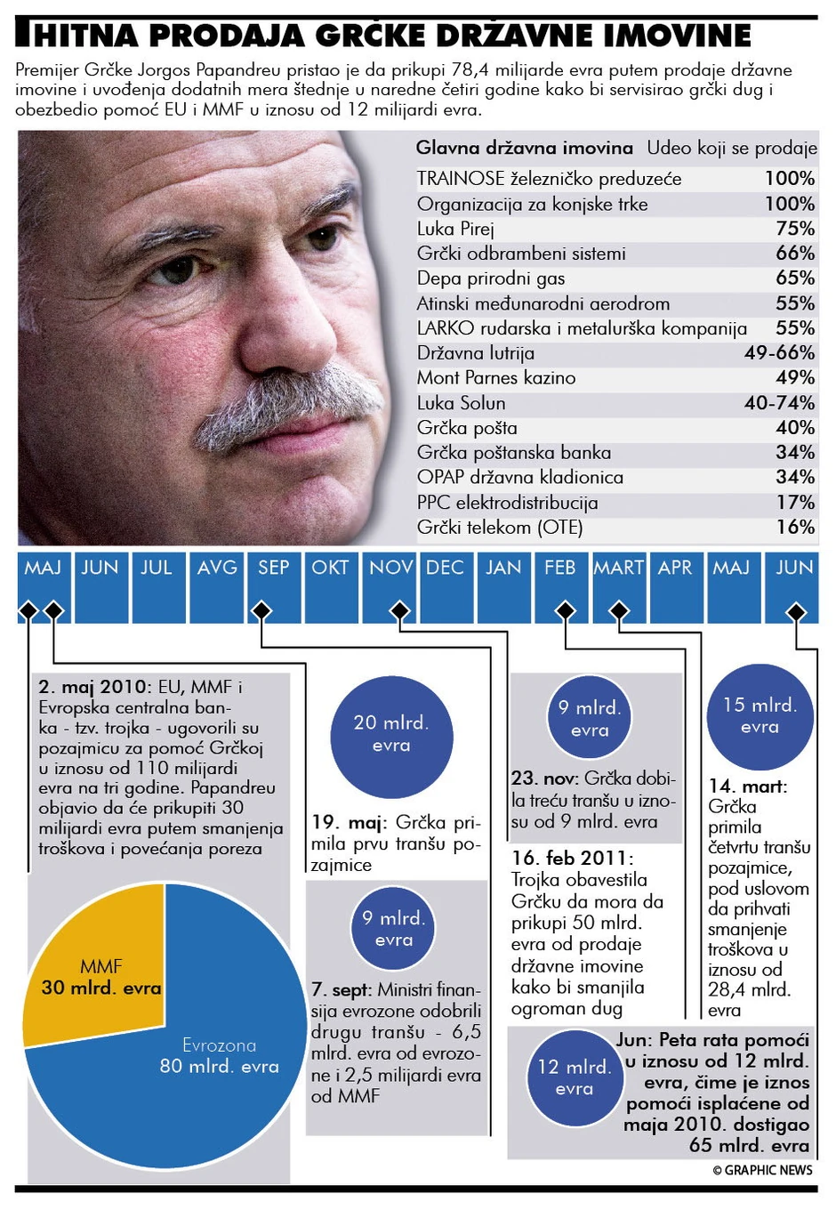Grčki premijer Jorgos Papandreu je obećao da će da prikupi oko 50 milijardi evra do 2015. godine putem programa privatizacije državne imovine, uključujući prodaju nekih aerodroma, državnih firmi i objekata koji su izgrađeni za Olimpijadu 2004. u Atini, ali su sada prazni. Bolan proces privatizacije je počeo: u ponedeljak je postignut sporazum o prodaji 10 odsto državnog udela u kompaniji “Grčki telekom” nemačkom “Dojče telekomu”.