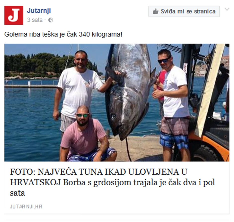U hrvatskom moru nadomak Rovinja danas ulovljena plavorepa tuna, teška čak 340 kilograma.