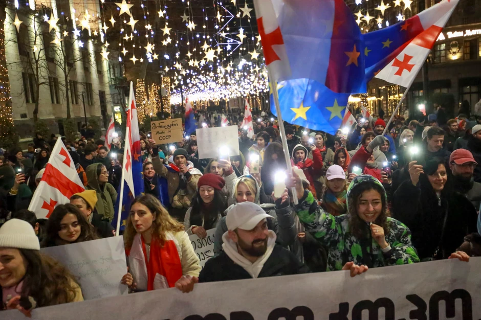 Demonstranti optužuju vladu Gruzijskog sna da udaljava zemlju od EU, a približava je Rusiji. Politička kriza je eruptirala nakon što je Gruzijski san pobedio na parlamentarnim izborima u oktobru, za koje je OEBS rekao da su bili obeleženi kupovinom glasova, dvostrukim glasanjem, fizičkim nasiljem i zastrašivanjem.
