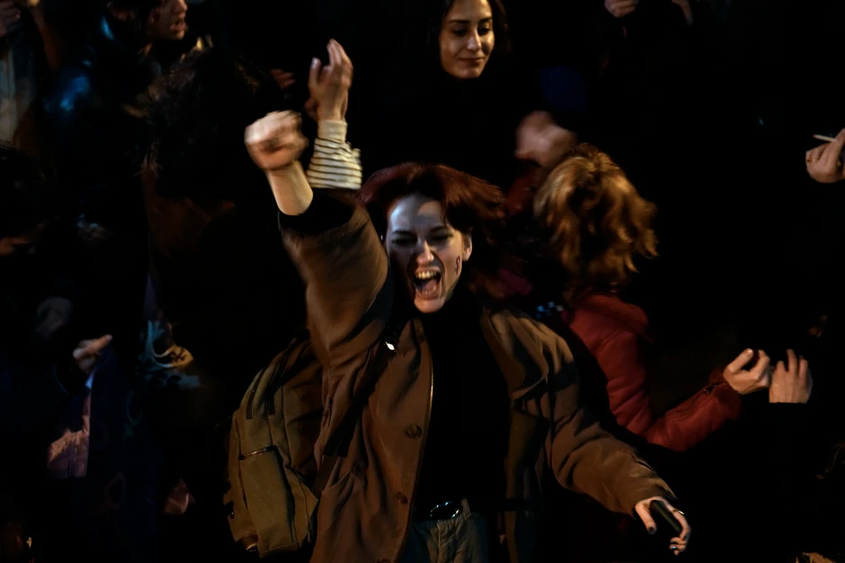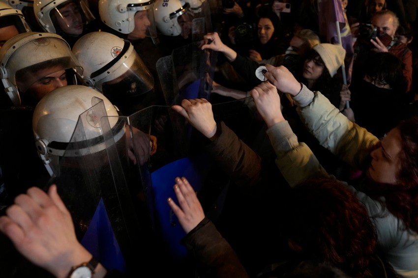 Žene su nosile pištaljke i uzvikivale slogane poput "Ne želimo da ćutimo, nismo preplašene i nećemo se povinovati", dok ih je policija sa opremom za suzbijanjem nemira gurala štitovima.