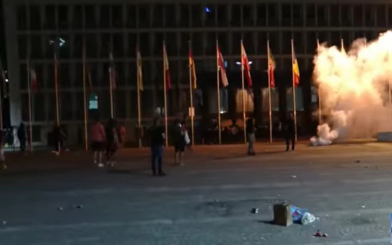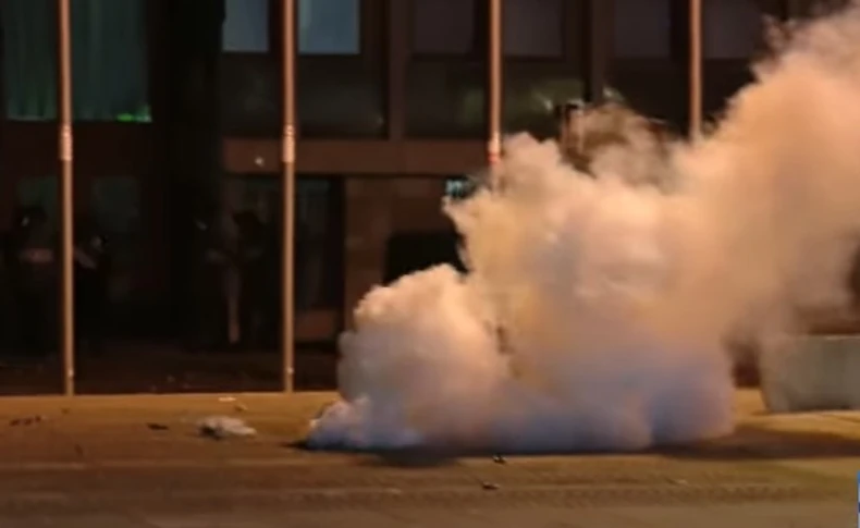 Kada se masa približila skupštini i počela da baca baklje, policija je odgovorila suzavcem i rasturila grupu. Mnogi demonstranti su pobegli, ali baklje i suzavac i dalje lete. Pojedini su zasuli kamenjem parkirano policijsko vozilo.