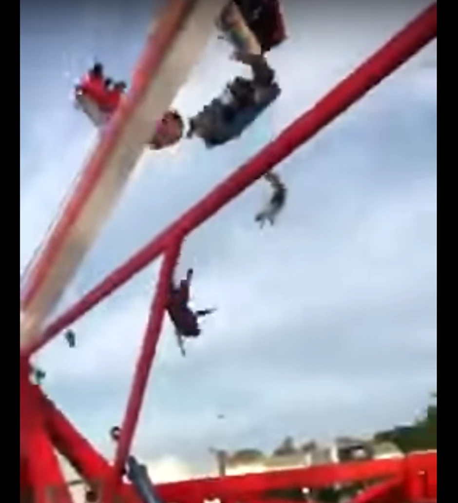 Kako se vidi na snimku koji je objavljen na internetu, mašina u zabavnom parku se bukvalno raspala u vazduhu, a ljudi su počeli da ispadaju.