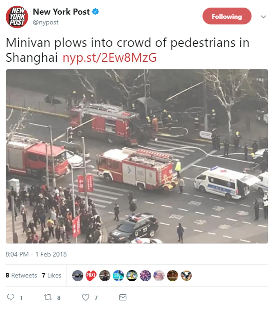 Šangajski list "Sinmin vanbao" objavio je da je kombi udario u pet do šest osoba koji su čekale na prelazak ulice, a lokalni dnevnik "Pengpaj" je naveo da je u vozilu bilo šest ljudi i nekoliko plinskih boca koje se obično koriste za kuvanje i grejanje.