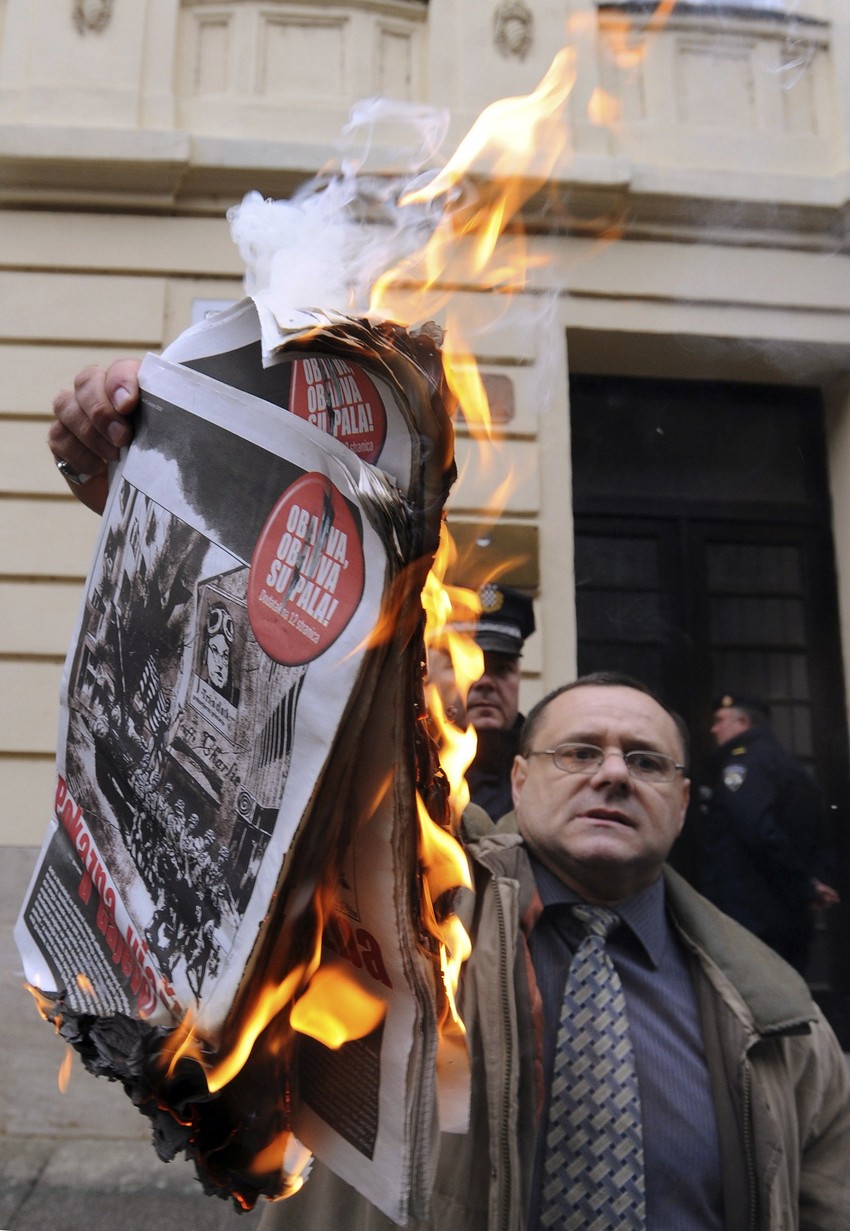 Oni su u znak protesta zapalili dva primerka najnovijeg broja "Novosti". Skup je obezbeđivao veći broj policijaca, a demonostranti su nosili više transparenata s natpisima "Vukovar", "Škabrnja", "HDZ + SDSS protivhrvatska koalicija" i "Hrvatska".