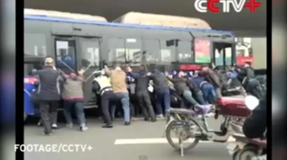 Grupa od dvadesetak ljudi uspela je da podigne autobus težak 13 tona, i na taj način pomogne nesrećnom čoveku koji je nakon što ga je autobus udario ostao zaglavljen ispod vozila.