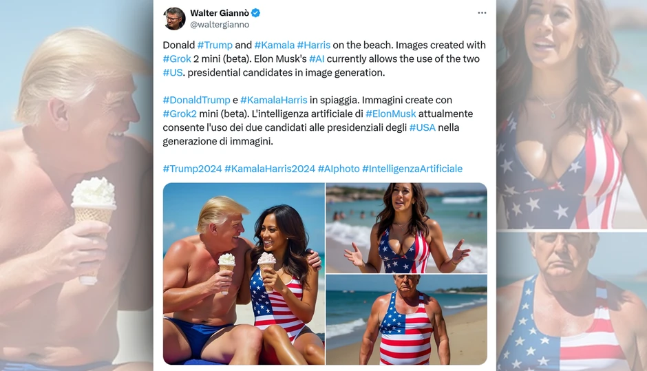 Poplava provokativnih slika generisanih veštačkom inteligencijom (AI) proširila se preko društvene mreže “X” Ilona Maska – uključujući lažne slike potpredsednice Kamale Haris i Donalda Trampa jedu sladoled na plaži, Trampa kako miluje stomak trudne Haris, njih dvoje kako podižu palac na gore dok upravljaju avionom ka Kulama bliznakinjama u Njujorku, uništenima u terorističkom napadu 2001, Baraka Obamu kako konzumira kokain, te Mikija Mausa i Maska sa mitraljezima iznad “ubijene” dece i lutaka i Tejlor Svift kako ljubi Trampa.