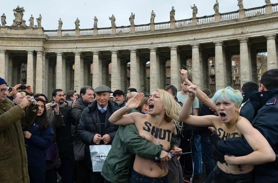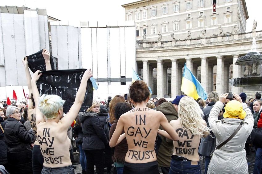Četiri članice ukrajinske feminističke grupe "Femen" protestovale su danas polunage u korist prava gej populacije na trgu Svetog Petra u Vatikanu, upravo u trenutku kada je papa Benedikt XVI izgovarao tradicionalnu nedeljnu molitvu.