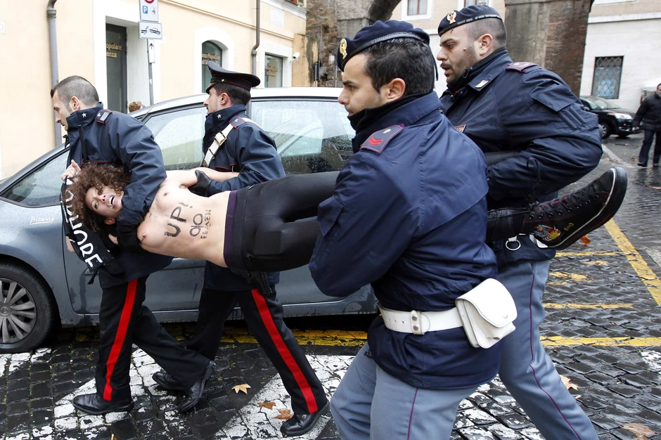 Četiri žene obnaženih grudi, sa natpisom "In gay we trust" (S verom u geja) na nagom delu tela, protestovale su pored ogromne božićne jelke na centralnom delu trga, ali ih je vatikanska policija ubrzo privela, preneo je AFP.