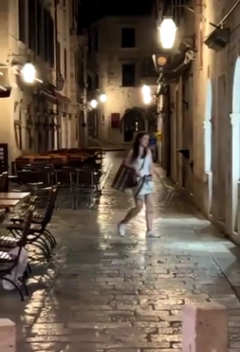 Prema izjavama očevidaca, očigledno pijana turistkinja uzela je stolicu sa terase zatvorenog restorana i njom počela da udara po zidu.
